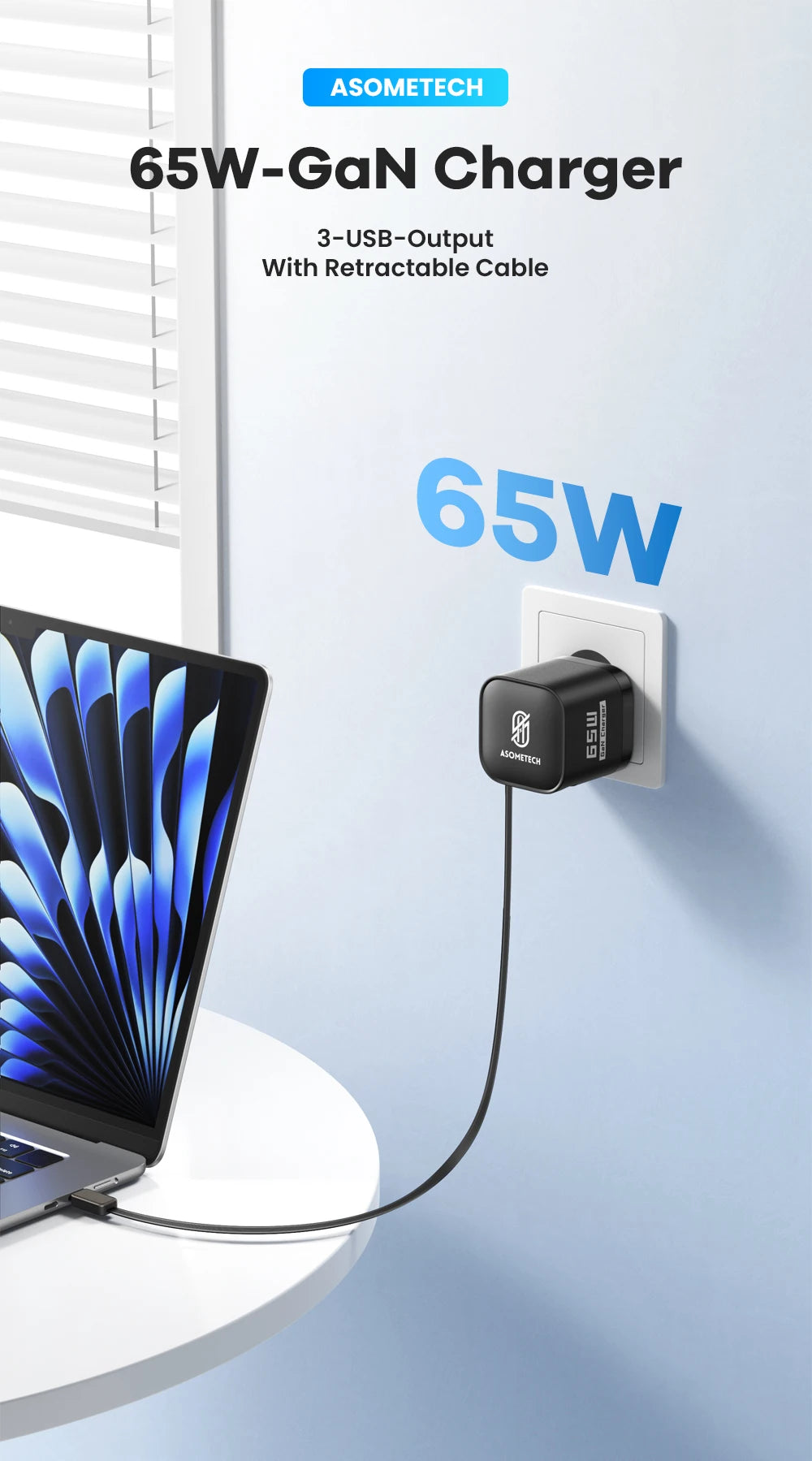 ASOMETECH 65W GaN USB Charger with Type C Retractable Cable 3 Port QC4.0 PD3.0 PPS Fast Charger for Macbook Laptop iPhone 16 15 14 Xiaomi